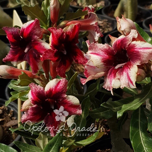 Espécie: Adenium obesum (Rosa do Deserto). Origem: Cultivada no Brasil pela Apolonia Grade. Garantia: Plantas 100% saudáveis e bem enraizadas. Floração: Abundante em condições ideais de cultivo.